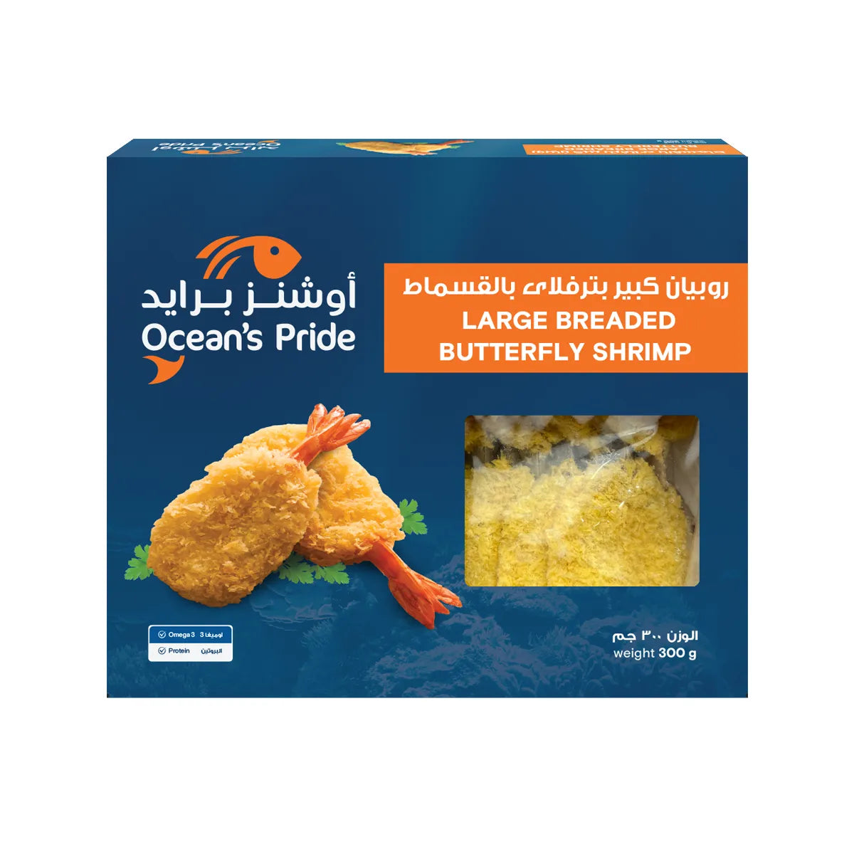 أشبع رغبتك في تناول المأكولات البحرية مع روبيان الفراشة الكبير المجمد والمغطى بالبقسماط. هذا الروبيان الممتلئ والعصير مغطى بطبقة مقرمشة من البقسماط، مما يُضفي توازنًا مثاليًا بين الملمس والنكهة. جاهز للطهي مباشرةً من المُجمد، هذه العبوة سعة 300 غرام مثالية لوجبة سريعة ولذيذة. ارتقِ بتجربة المأكولات البحرية مع أوشنز برايد واستمتع بسهولة تحضير المأكولات البحرية المجمدة دون المساومة على المذاق.
