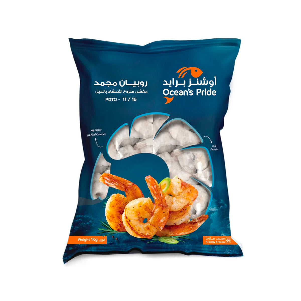 Frozen Peeled, Deveined, Tail-On Shrimps.